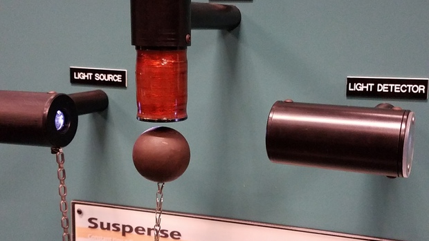 Electromagnets attract a sphere, suspending it in this exhibit.