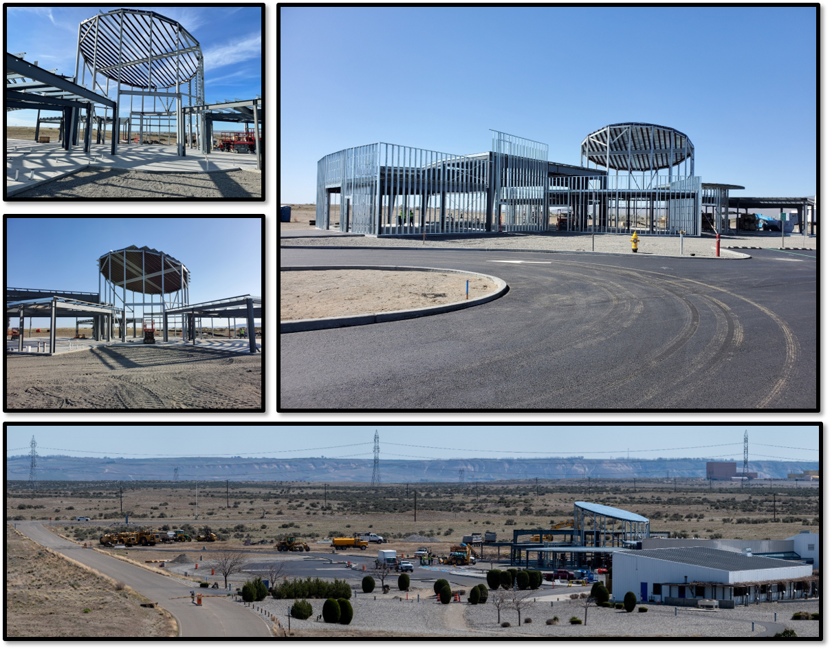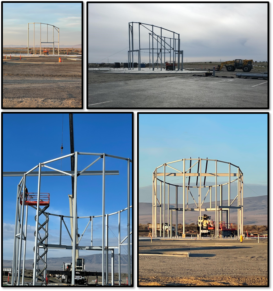 LExC rises from the ground. All the groundwork is done and foundations laid. LExC is now rising from the desert floor! Here, the main rotunda entryway structure is assembled. Rattlesnake Mountain rises in the distance. The public patio behind this main area will have a beautiful unobstructed view of the shrub steppe and Rattlesnake Mountain. Those who have visited LIGO Hanford Observatory will recognize the public parking lot in the top-right photo, showing them where LExC is situated. (Photo Credits: Top left: D. Savior. Top right: F. Armijo/LIGO Lab. Bottom two: B. Gately/LIGO Lab)