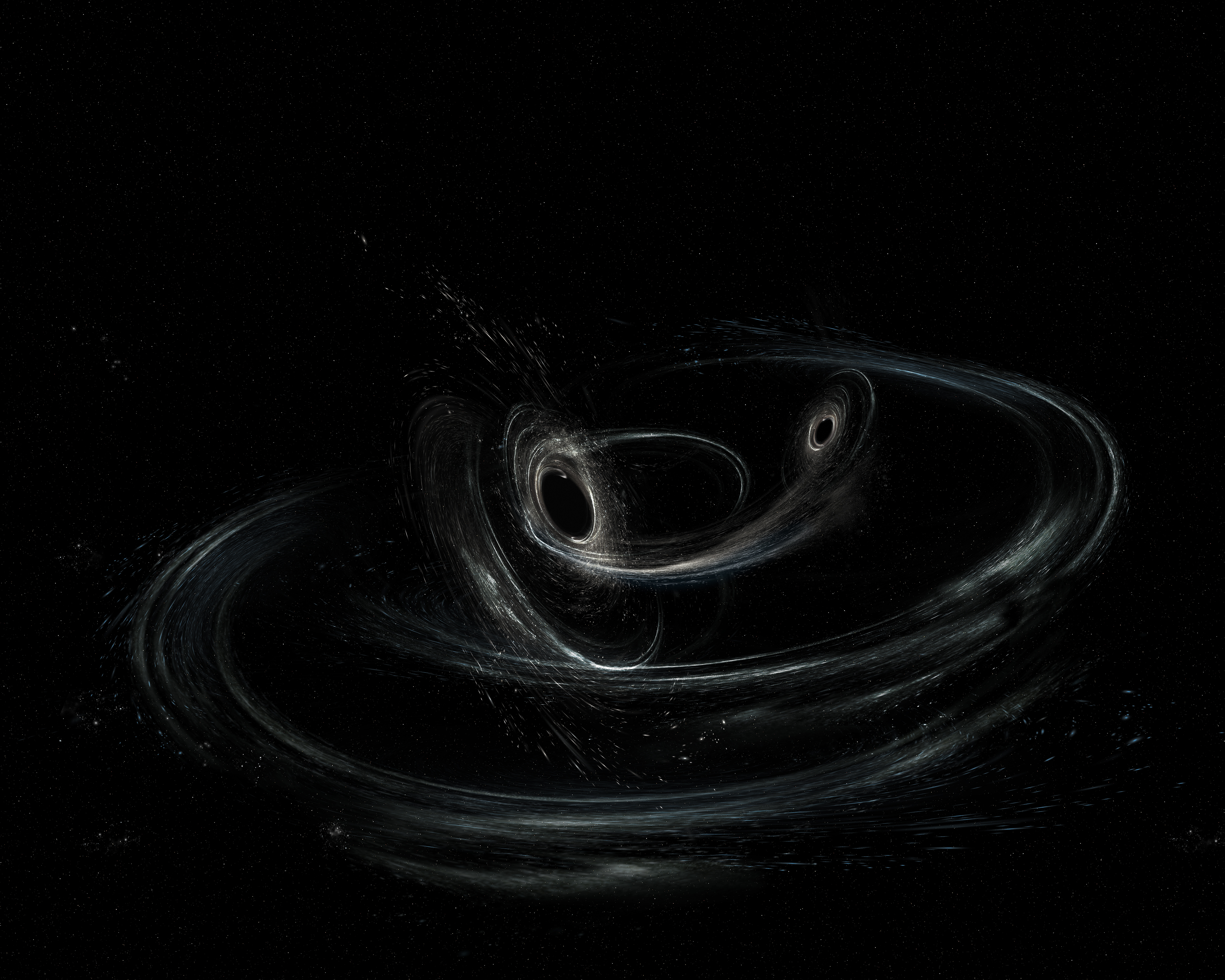 Artist's conception shows two merging black holes similar to those detected by LIGO. The black holes—which will ultimately spiral together into one larger black hole—are illustrated to be orbiting one another in a plane. The black holes are spinning in a non-aligned fashion, which means they have different orientations relative to the overall orbital motion of the pair. There is a hint of this phenomenon found by LIGO in at least one black hole of the GW170104 system. Credit: LIGO/Caltech/MIT/Sonoma State (Aurore Simonnet)