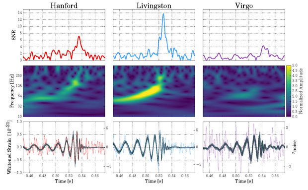 This graphic shows the data from each of the three observatories. The top graph shows the Signal to Noise Ratio - or roughly how significant the detection was. The middle graph shows the "chirp" or frequency shift across time. The bottom graph shows the wave form.