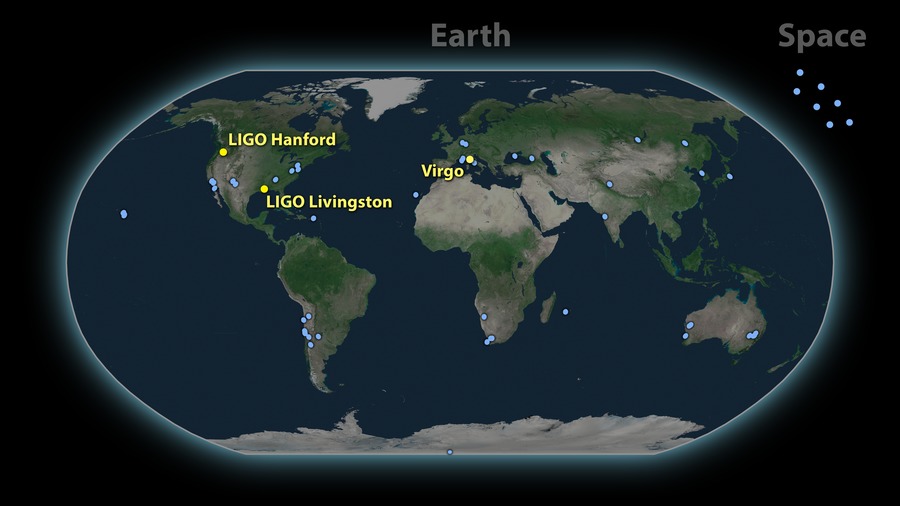 A map of the approximately 70 light-based observatories that detected the gravitational-wave event called GW170817. On August 17, the LIGO and Virgo detectors spotted gravitational waves from two colliding neutron stars. Light-based telescopes around the globe observed the aftermath of the collision in the hours, days, and weeks following. They helped pinpoint the location of the neutron stars and identified signs of heavy elements, such as gold, in the collision's ejected material.