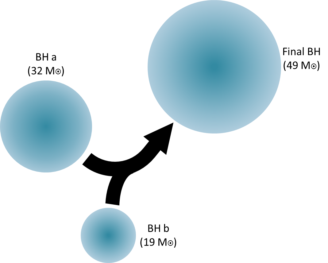 On January 4th, 2017, LIGO detected two black holes merging into one. One of the black holes was 32 times the mass of the Sun (32 M⊙, where M denotes mass and ⊙ is a symbol for the Sun) while the other was 19 times the mass of the Sun. When they merged, they created a black hole 49 times the mass of the Sun. The coalescence instantly converted 2 solar masses of black hole mass into the energy that rattled spacetime enough to generate the gravitational waves we detected almost 3 billion years after it occurred. (Caltech/MIT/LIGO Lab)