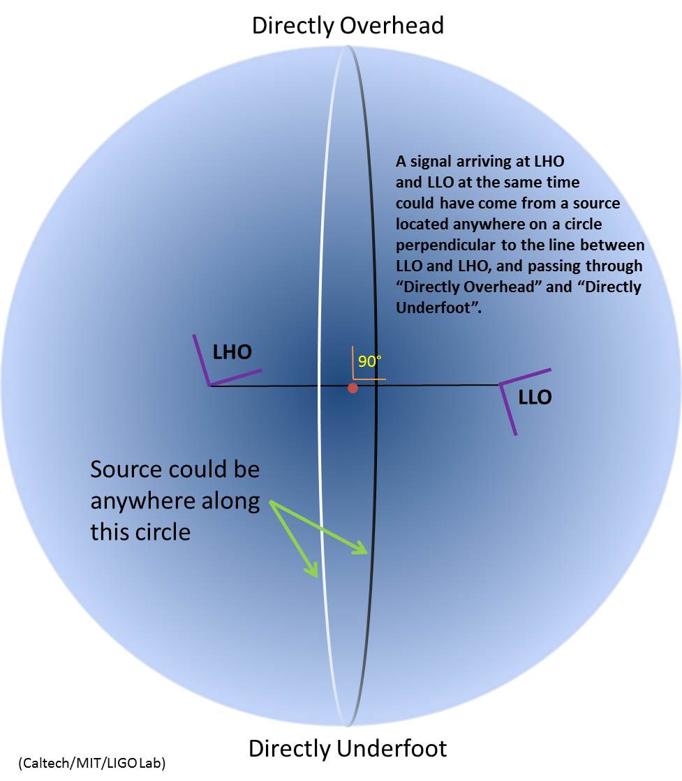 With two detectors, and the fact that gravitational waves travel at the speed of light, we can look at the relative times of arrival of signals at the detectors to give us an idea of where the source might be on the sky. For example, if a source is exactly ‘overhead’ the signal will arrive at both detectors at the same time. But wait…the same timing would happen if the source was exactly ‘underfoot’. In fact, if a signal is received at both sites simultaneously, the source could be located anywhere along a perpendicular circle drawn directly between the two detectors and connecting overhead to underfoot (see figure at right)! While small differences in the detector’s sensitivity enable us to exclude some parts of the circle, that’s a very large search field.