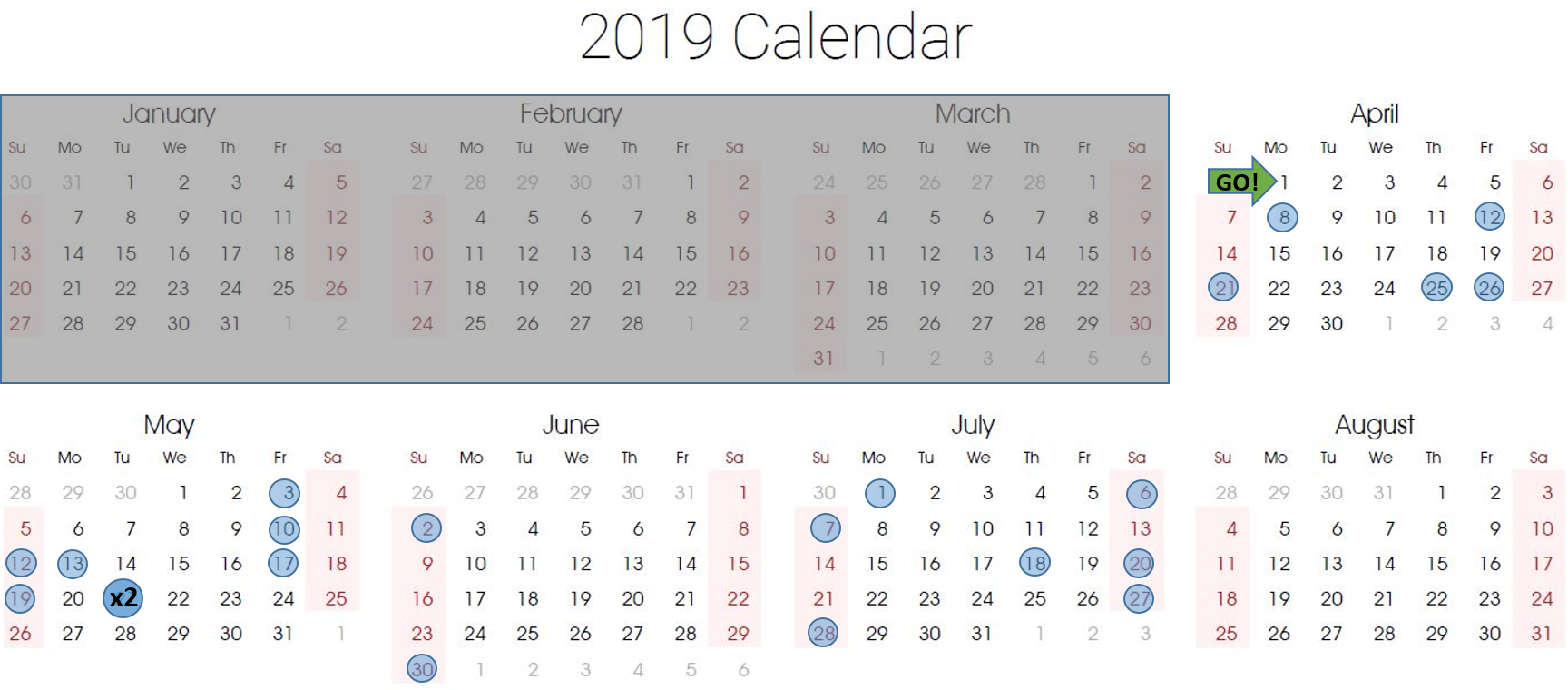 The blue circles indicate days on which a candidate detection was made between the start of LIGO's third observing run (O3) on April 1, 2019 and July 31, 2019. They're called "candidates" because they have yet to be vetted by a thorough analysis process--something that can take months to complete. Note that two possible detections were made on May 21st. In this time, LIGO and Virgo (working together) have detected 22 candidate gravitational wave events.