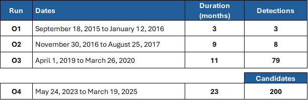 O1 to O3 included about 23 months-worth of observing time between 2015 and 2020. In that time, 90 GW detections were made. In the first 23 months of O4, 200 GW candidates have been logged. O4 is currently scheduled to end in November, 2025.
