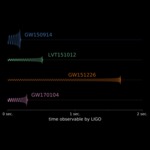 The video contrasts the two events GW150914 (top) and GW170104 (bottom). The strength of the gravitational wave is indicated by elevation and color. We rescale the amplitude of the gravitational wave during the simulation to show the signal during the entire animation and not only close to merger, where it is strongest. The sizes of the black holes are increased by a factor of two to improve visibility. The two animations for GW150914 and GW170104 start at the same gravitational wave frequency of about 25Hz, but because of the different total mass of the binaries, GW150914 merges earlier and has a smaller number of orbits until merger.